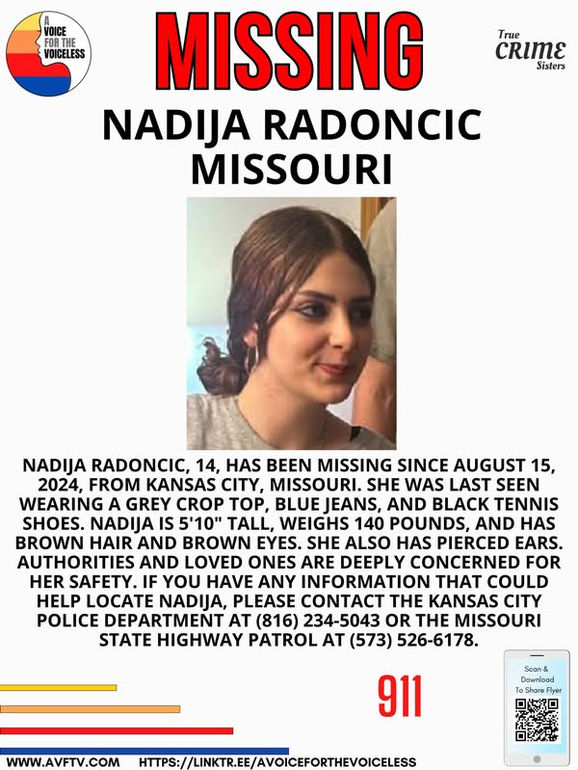 14-year-old Nadija Radoncic has been missing since August 15, 2024, from Kansas City, Missouri. She was last seen wearing a grey crop top, blue jeans, and black tennis shoes.