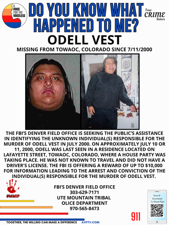 The FBI’s Denver Field Office is seeking the public’s assistance in identifying the unknown individual(s) responsible for the murder of Odell Vest in July 2000. On approximately July 10 or 11, 2000, Odell was last seen in a residence located on Lafayette Street, Towaoc, Colorado, where a house party was taking place. He was not known to travel and did not have a driver's license. The FBI is offering a reward of up to $10,000 for information leading to the arrest and conviction of the individual(s) responsible for the murder of Odell Vest.
